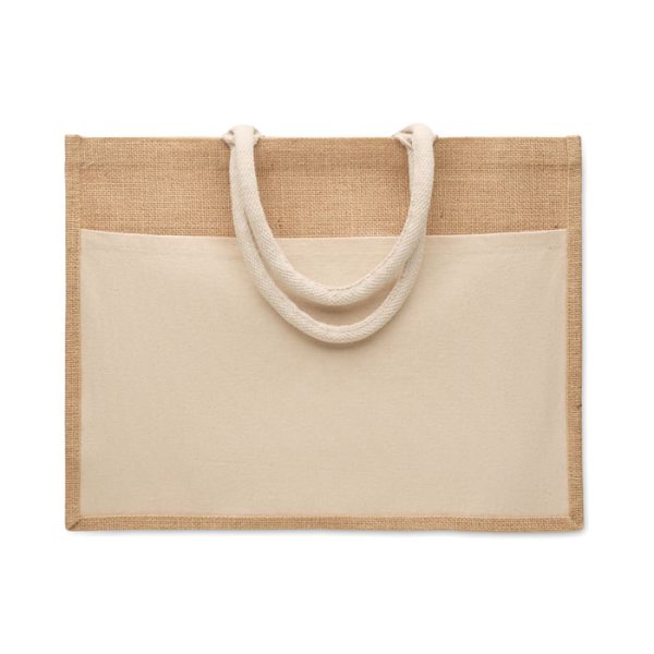 Sac shopping en jute laminé et toile de coton, avec poignées en corde.