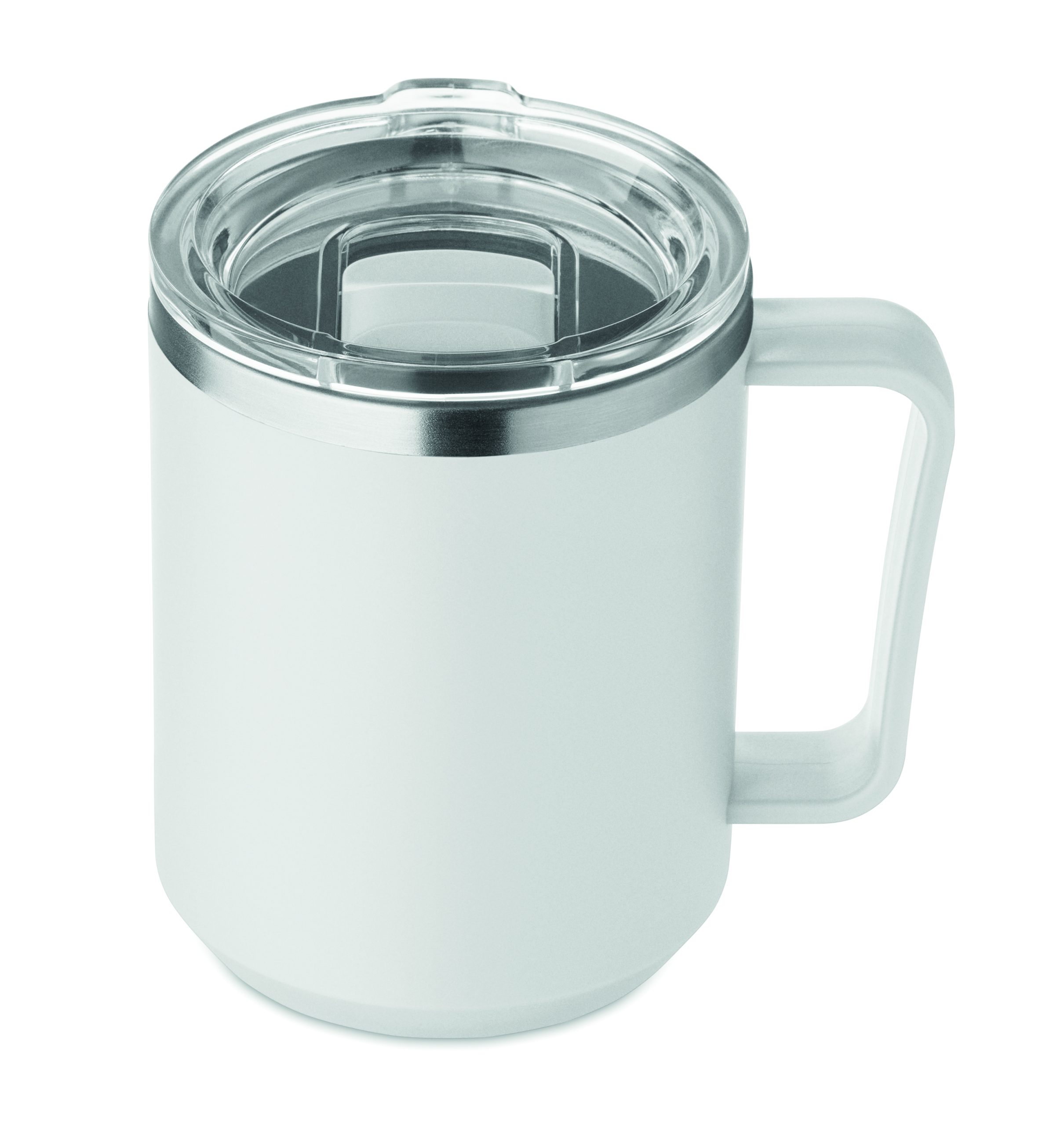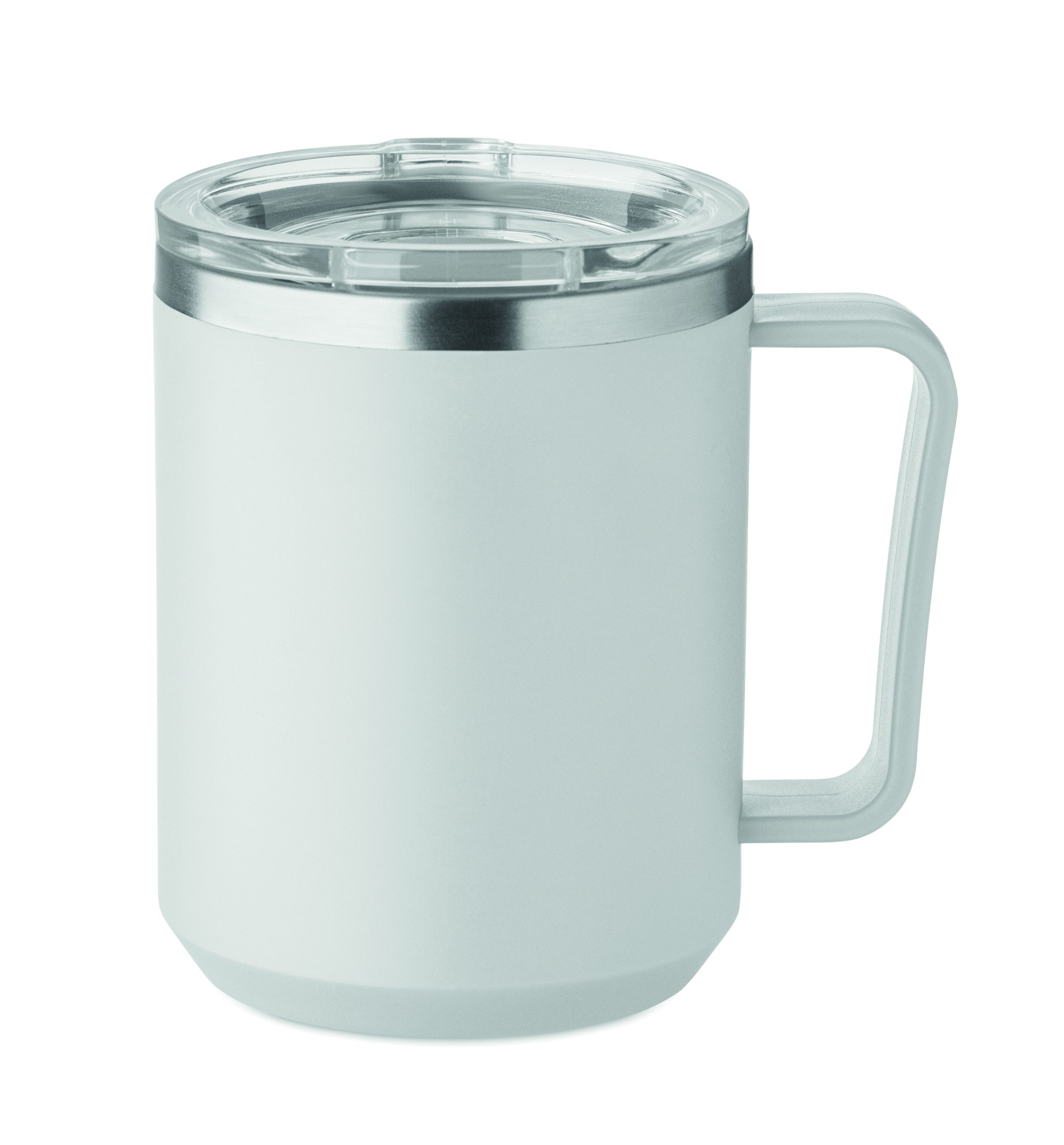 Mug à double paroi avec intérieur en acier inoxydable recyclé à 90 % et 10 % et extérieur en polypropylène recyclé. Couvercle coulissant AS transparent inclus. Capacité de 400 ml.