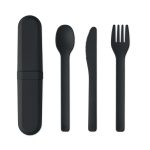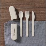Set de couverts réutilisables avec étui en PLA de maïs. Chaque set comprend une fourchette, un couteau, une cuillère et un étui.